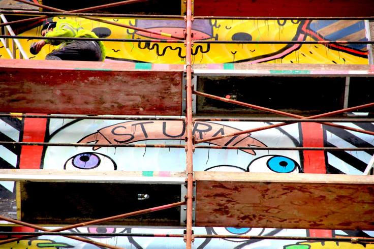 Als plakatives Kunstwerk im öffentlichen Raum bleibt die 16 x 4,5 m große Arbeit bis September und verschönert die triste Umgebung.